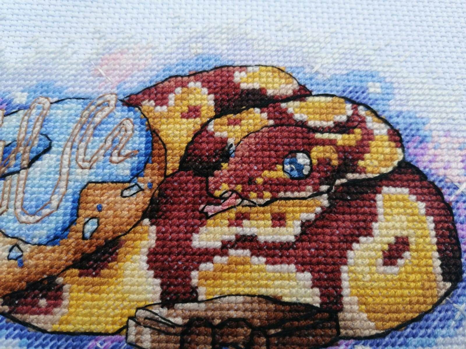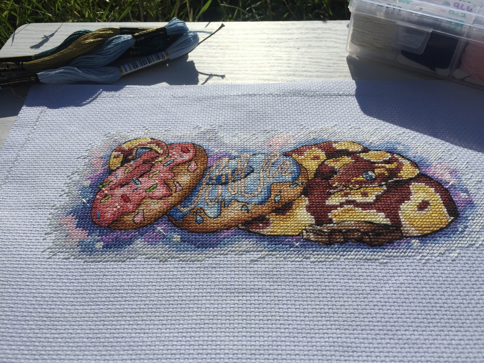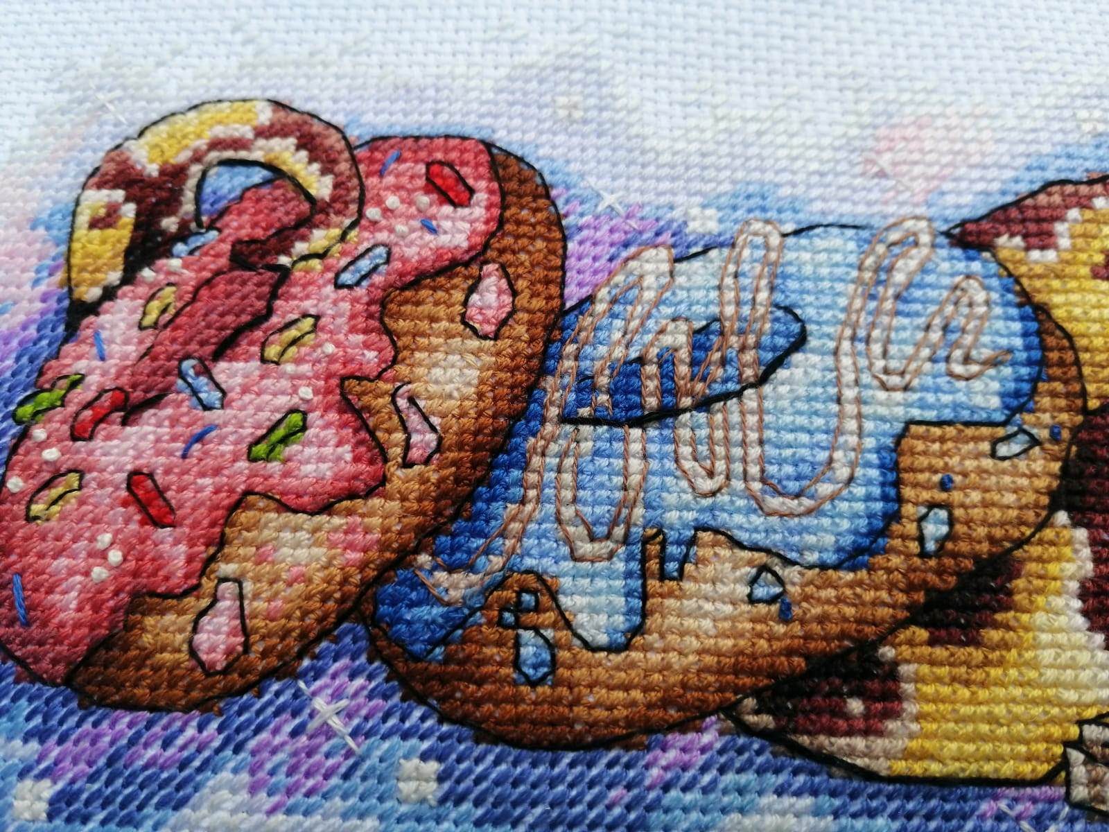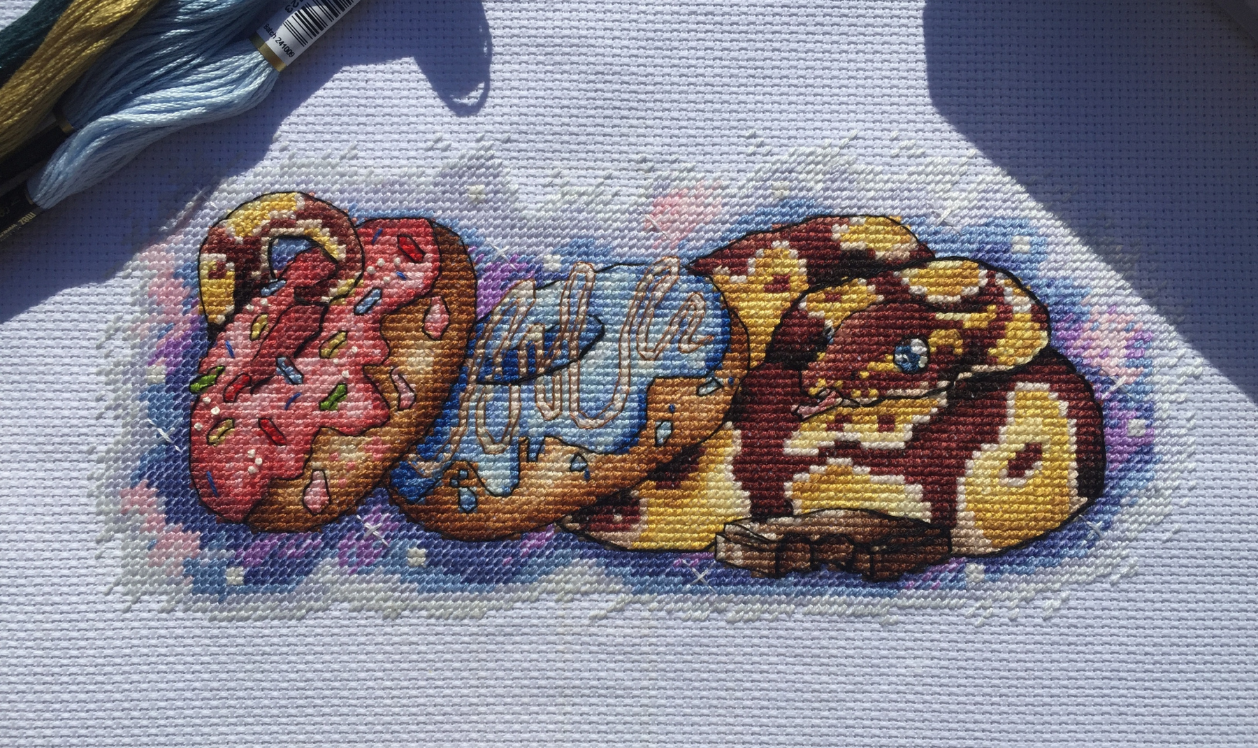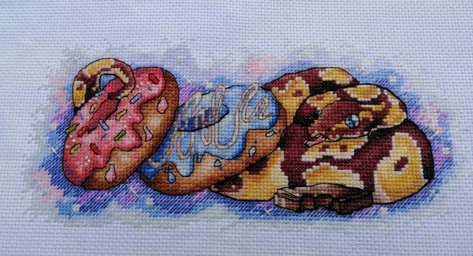 Our skilled embroiderer, Soňa Krebesová, has patiently played with stitching crosses to truly bring this pattern to life. See for yourselves! The colours, the shades and the light play just add to the lovely effect, depth and 3D imagery thus making the entire picture come alive (the yummy yummy donuts… the snake rather not ????). One doesn’t know what to feast his or her eyes on first.